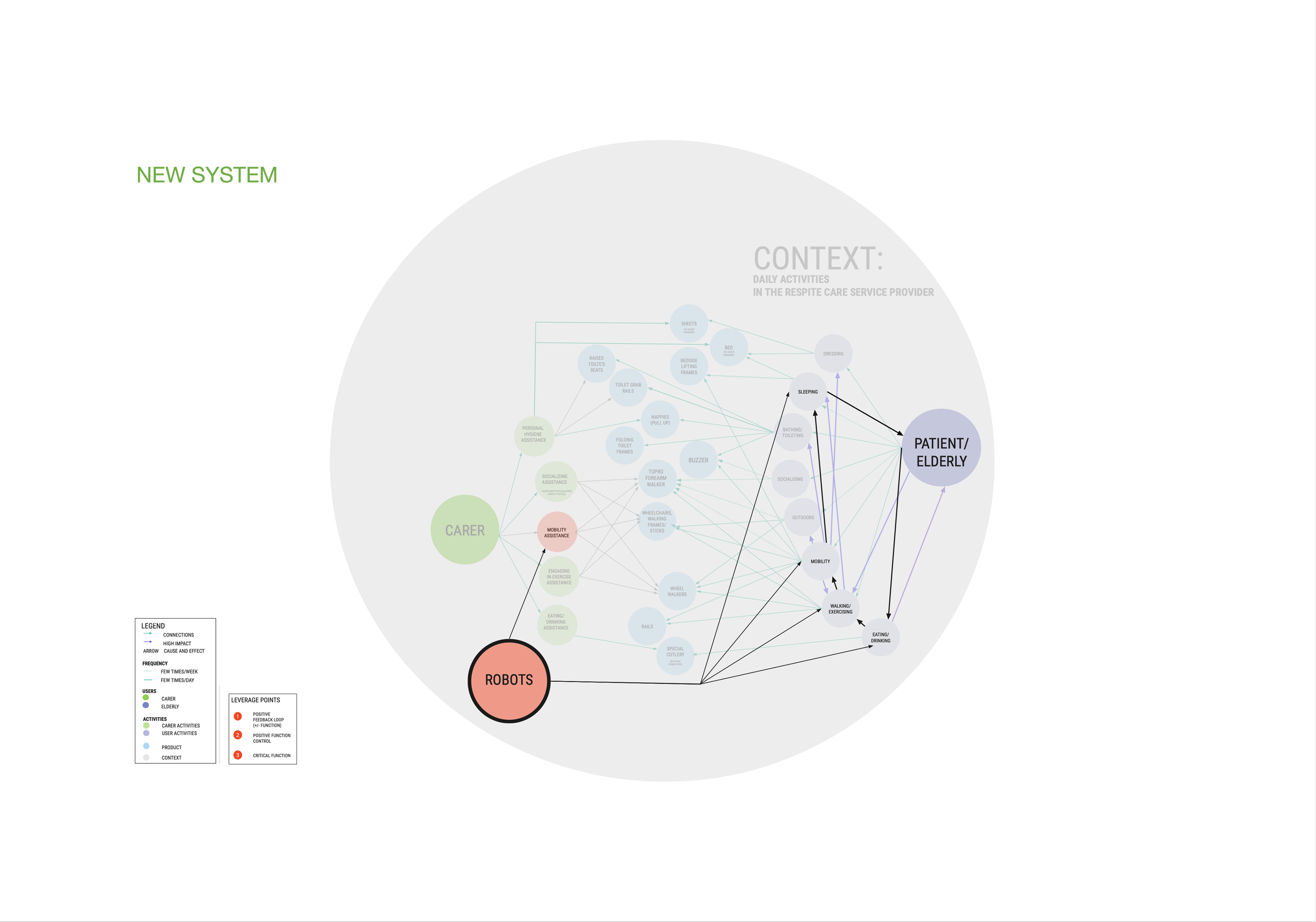 All complexities are significantly improved after introducing robots in the elderly’s day to day life. Complexity no. 1 - the positive feedback loop is improved by increasing mobility with the use of robots which are designed to increased user’s mobility. Complexity no. 2 positive function control (mobility assistance) is also improved. Robots are used by the elderly to assist them with mobility and increase their mobility over time. No. 3 – critical function - the carer. Mobility assistance provided by the carer is now provided by the robot, thus helping elderly gain more control and independence.